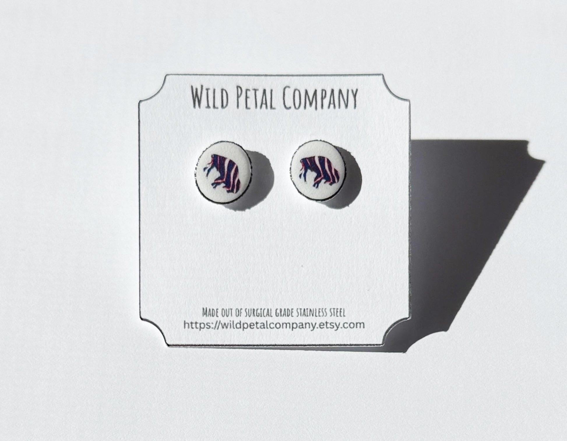 Celebrate your love for Buffalo and the USA with these bold red, white, and blue buffalo earrings! Featuring a stylized buffalo silhouette in patriotic colors, these studs are perfect for game day, Fourth of July, or everyday team spirit.