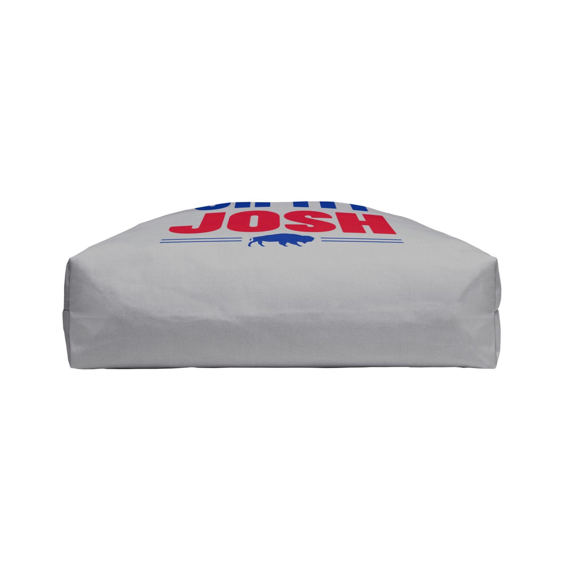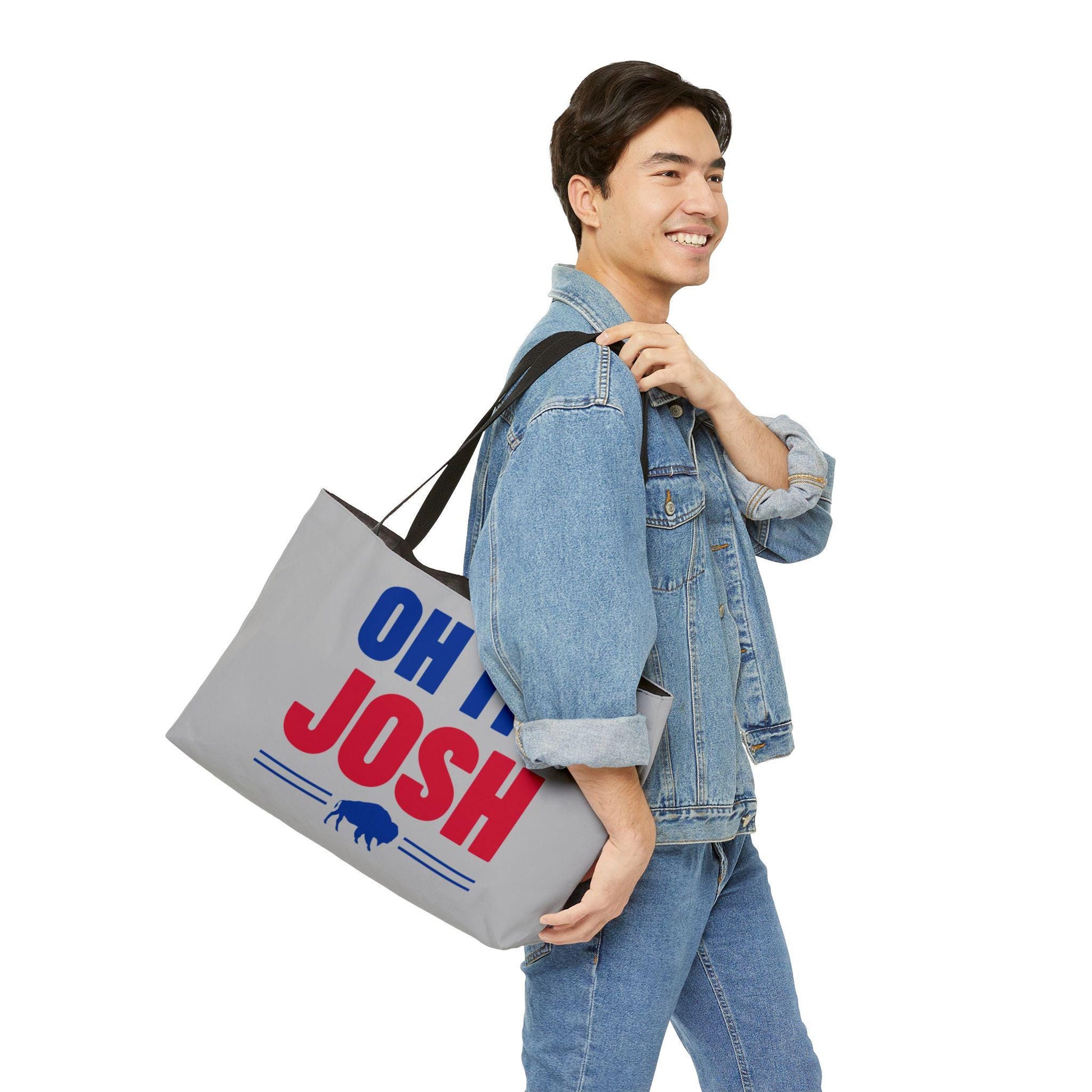 Carry a slice of playful hometown pride with this roomy weekender tote. Bold red and blue lettering reads OH MY JOSH across a neutral background, anchored by a small buffalo silhouette — a nod to spirited local fandom or inside-joke charm. The all-over print keeps the design vivid from every angle while the structured T-bottom gives the bag shape and space for weekend gear, market finds, or everyday essentials. Black woven handles and a dark-lined interior keep it looking clean, even after heavy use. Lightweight yet stable, it slips easily over your shoulder and stands up to commuter commutes, farmers’ markets, and post-game hangouts with friends.